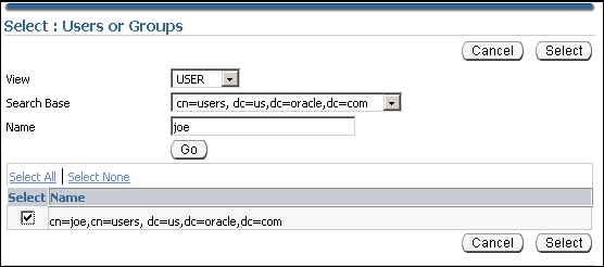 Select cn=joe,cn=users,dc=us,dc=oracle,dc=com. Click Select.