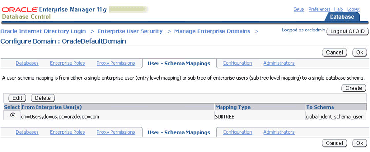 Enterprise User Security can be managed using Enterprise Manager. Example 2-2 maps the DN, cn=users, dc=us, dc=oracle, dc=com to the shared database schema, global_ident_schema_user.
