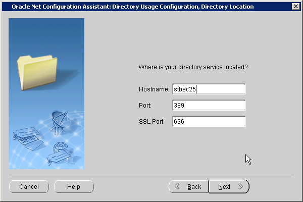 The first step in configuring Enterprise User Security is to configure the database to use the directory. Running the Net Configuration Assistant (NetCA) tool enables you to configure the directory host name and port that your database should use.