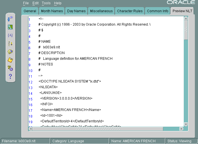 The NLT (National Languare Text) file is an XML file with the file extension .nlt that stores the settings for a specific language, territory, character set, or linguistic sort. The Preview NLT tab page presents a readable form of the file so that you can see whether the changes you have made are correct. You cannot modify the NLT file from the Preview NLT tab page. You must use the specific tools and procedures available in Oracle Locale Builder to modify the NLT file.