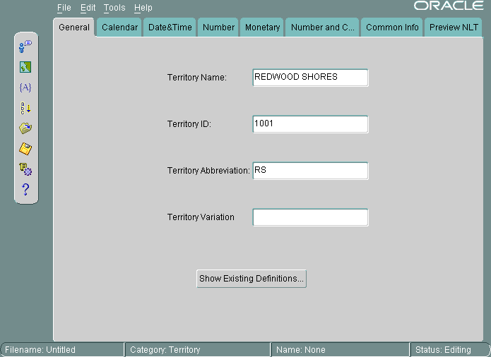 Oracle Locale Builder includes online help.When you choose New Language, New Territory, New Character Set, or New Linguistic Sort, the first tab page that you see is labeled General. Click Show Existing Definitions to see the Existing Definitions dialog box.