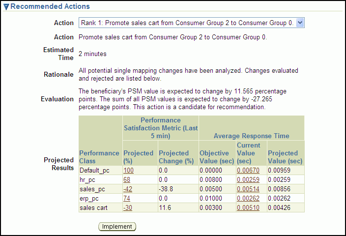 You can select different recommendations using the Action drop-down list. Oracle Database QoS Management tries to provide the best recommendation to the QoS administrator, but you might decide that a different action would produce better results. If you select a different action, then the information in the Recommendation Actions and the Situation Analysis sections are updated to reflect the impact of the alternate recommendation. You cannot implement an alternate recommendation if that recommendation has been rejected by the Oracle Database QoS Management System for not providing enough benefit to the system as a whole.