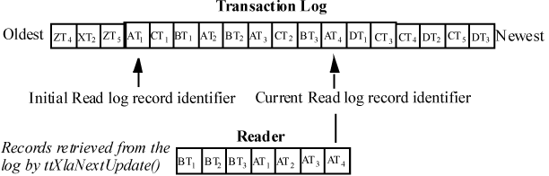 As described in "Retrieving update records from the transaction log", use the ttXlaNextUpdate or ttXlaNextUpdateWait function to return a batch of records for committed transactions from the transaction log in the order in which they were committed. Each call to ttXlaNextUpdate resets the Current Read log record identifier of the bookmark to the last record read, as shown in Figure 5-3. The Current Read log record identifier marks the start position for the next call to ttXlaNextUpdate.